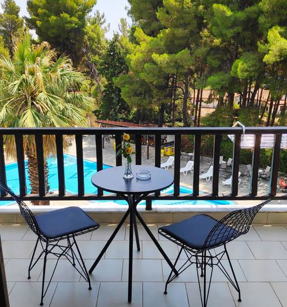 Fully renovated room with a double bed, on the upper floor with pool view, ideal for couples .